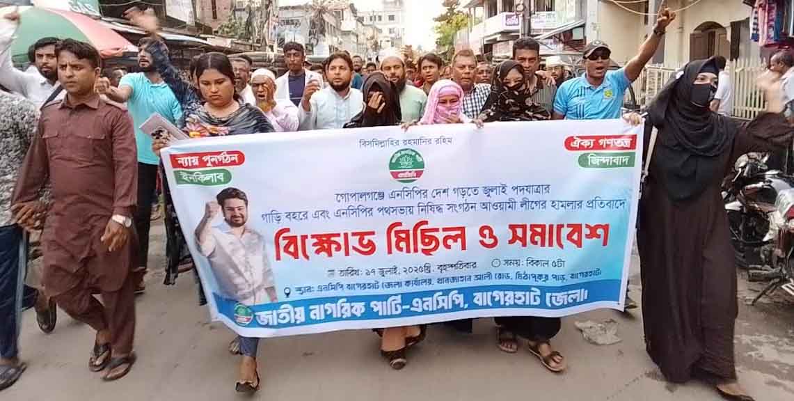 গোপালগঞ্জে জাতীয় নাগরিক পার্টির (এনসিপি) কেন্দ্রীয় নেতাকর্মীদের ওপর আওয়ামী লীগ ও নিষিদ্ধ ছাত্রলীগের সন্ত্রাসী হামলার প্রতিবাদে বাগেরহাটে বিক্ষোভ মিছিল ও সমাবেশ করেছে এনসিপি। বৃহস্পতিবার (১৭ জুলাই) বিকেলে শহরের মিঠাপুকুরপাড় থেকে বিক্ষোভ মিছিল বের করেন জেলার নেতৃবৃন্দ। শহরের বিভিন্ন গুরুত্বপূর্ণ সড়ক প্রদক্ষিণ করে প্রেসক্লাবের সামনে এসে সমাবেশে মিলিত হয় মিছিলকারীরা।