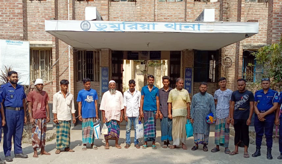 ডুমুরিয়া থানা পুলিশের অভিযানে গ্রেফতার হয়েছে ১১ জন। ১. মোঃ শাহিন আলম গাজী (২৩), ২। জিআর-৪১০/১৮ (ডুমু) এর আসামী শুভ বিশ্বাস, ৩। সিআর-১১৫/২৩ (ডুমু) এর আসামী মোঃ হোসেন শেখ, ৪। জিআর-৯৪/২৩ এর আসামী জব্বার শেখ (৫৫), ৫। সিআর- ৫/২২ (ডুমু) এর আসামী রাকিবুল ইসলাম ফকির (৩০), ৬। পারিঃ জারিঃ ০৭/১৯ এর আসামী মোঃ রাজ্জাক মাহমুদ, ৭। সাজা সিআর-৫০০/২০ (ডুমু) এর আসামী ফারুক হোসেন বিশ্বাস, ৮। সিআর-৪৮৬/২৩ (ডুমু) এর আসামী অনুপম কুমার রায় (১৮) এবং ডুমুরিয়া থানার জিডি নং-১১৫, তারিখ-০৩/০৫/২০২৪ ইং, ধারা-১৫১ সিআরপিসি এর আসামী ৯। মোঃ সাকিব শেখ (২০), ১০। মোঃ মিনার মোড়ল (২২) ও ১১। মোঃ আছাবুর সরদার (২৮) কে গ্রেফতার করে তাঁদের জেলহাজতে পাঠানো হয়েছে।