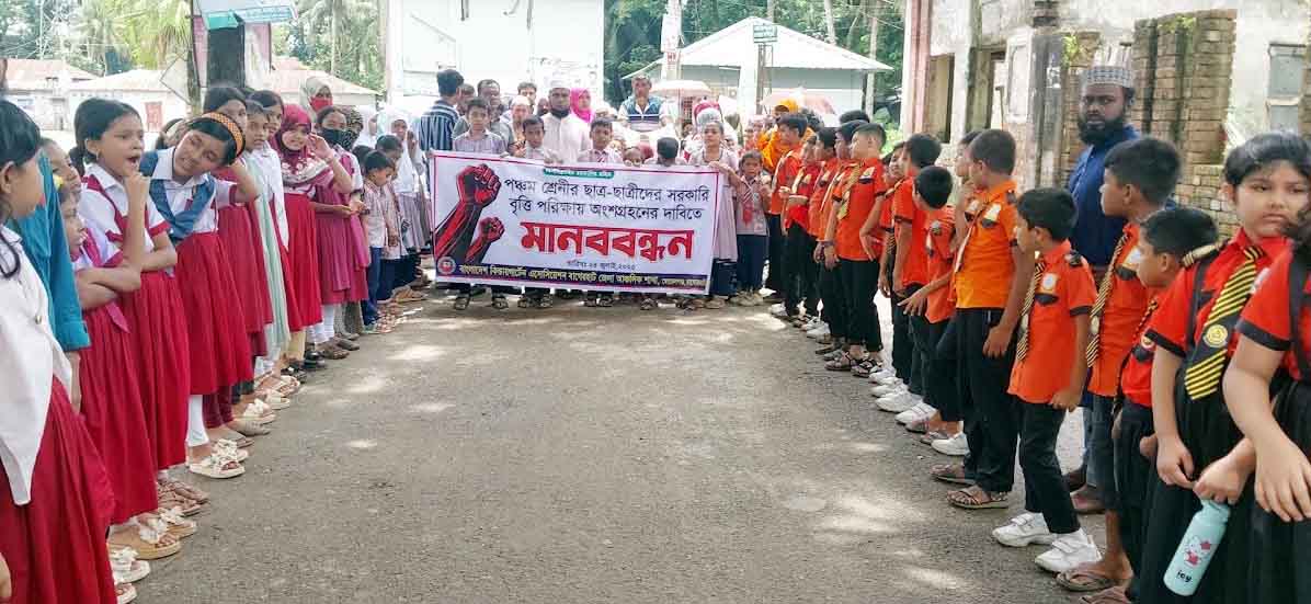 বাগেরহাটের মোরেলগঞ্জে কিন্ডারগার্টেন স্কুলের ৫ম শ্রেনীর ছাত্র-ছাত্রীদের সরকারি বৃত্তি পরীক্ষায় অংশ গ্রহনের দাবিতে মানববন্ধন কর্মসূচি পালিত হয়েছে।বৃহস্পতিবার (২৪ জুলাই) দুপুরে উপজেলা পরিষদ প্রশাসনিক চত্বরে এলাকায় মোরেলগঞ্জ উপজেলার বিভিন্ন কিন্ডার গার্টেনের শতাধিক শিক্ষার্থী ও শিক্ষক এই মানববন্ধনে অংশগ্রহন করেণ।